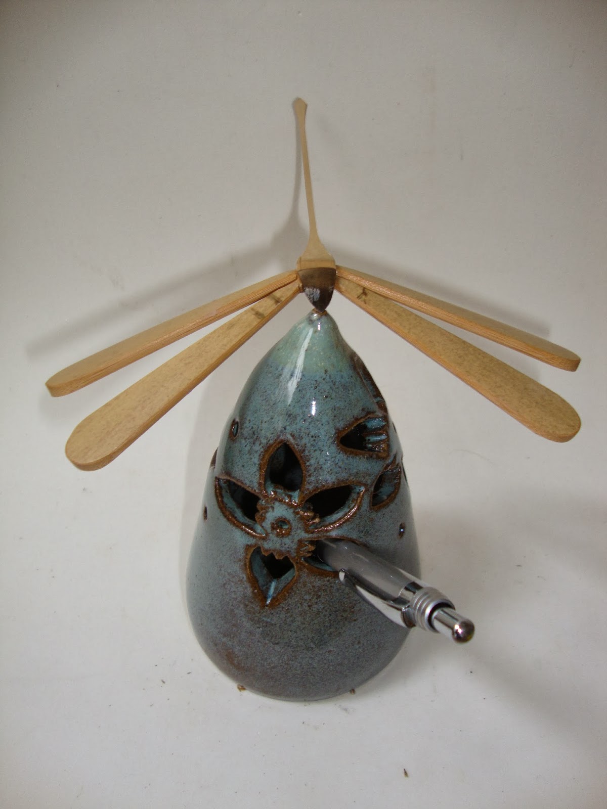 Peça em cone de cerâmica e libélula de bambu. Para arranjos ou porta lápis.